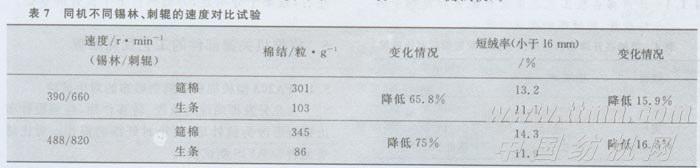 根据国内外的经验,提高锡林的速度可使纤维在锡林上分梳负荷因锡林速度提高而降低,使锡林表面单位面积内纤维密度减少,从而,提高了锡林盖板对纤维的分梳质量,许多棉结被分梳开。锡林速度提高后,梳理力并不成比例增大,所以对损伤纤维的副作用并不明显。同时,为保持锡林、刺辊的线速比(3:1),刺辊速度相应提高,试验结果见表7(AFIS测试仪)。