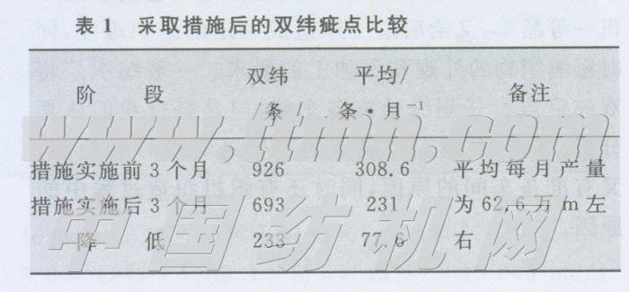 由表1可以看出,措施实施前后双纬疵点由原来的每月308.6条降低为每月231条,平均每月减少77.6条,收到了显著的效果。