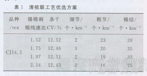 清梳联工序的关键是寻找短绒和棉结的平衡点,而刺辊速度、锡林速度、锡林刺辊线速比是我们研究的关键点,刺辊速度降低对短绒增长有利,锡林刺辊线速比的提高对棉结有利。这是由于锡林刺辊线速比低时,纤维从刺辊向锡林转移困难,纤维随刺辊回转,一方面轧煞锡林,另一方面也易导致纤维在刺辊表面搓转成棉结,而且低速率也易造成纤维在锡林后罩板气流高压区形成塞且进入该区棉层较厚,也易导致纤维进入盖板工作区时有打滚现象而增加棉结。因此我们通过试验,最终我们确定刺辊速度为1800 r/min、锡林刺辊线速比为2.14:1,如表1。