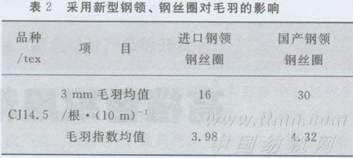 钢领、钢丝圈在使用过程中存在磨合期、稳定期与衰退期。钢领、钢丝圈使用寿命加长,则稳定期相应加长,对减少和稳定成纱毛羽十分有利。此次开纺高档色织用纱我们选用了进口钢丝圈,取得了良好的效果如表2。