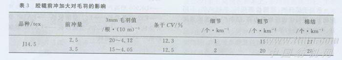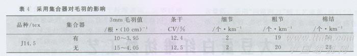 (3)胶辊前冲加大、采用集合器均对减少成纱毛羽有显著效果,见表3、表4。