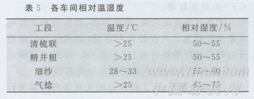 清梳联工序要求相对湿度低一些,如相对湿度偏高,生条结杂大幅增加。精并粗工序,如湿度过低会产生胶辊吸花,产生粗细节;湿度过高造成罗拉、胶辊裹花,产生大量纱疵。细纱车间,温湿度影响纤维的刚性、导电性,因而对成纱毛羽有影响。相对湿度大一些,纤维较柔软,易于被捻入纱体中。相对湿度太低,易产生静电,使毛羽增加。络筒车间因纱线与机件摩擦产生的静电导致纱线毛羽大幅增加,采用较大的湿度以减少静电,从而减少毛羽的增加。经实践证明各间相对温湿度控制如表5所示。