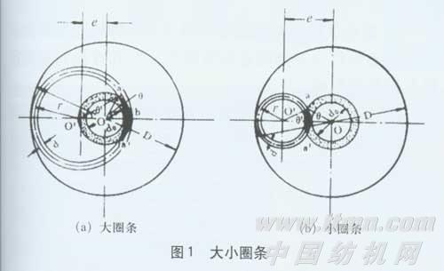圈条成型的主要参数有:条筒卷装直径D、偏心距e、棉条直径d、圈条半径r、气孔直径d0、圈条速比i等。其中偏心距e是圈条盘中心与圈条公转中心(条筒中心)问的距离,其大小由条筒直径、圈条半径和气孔直径等决定。圈条速比i则是圈条盘与底盘的转速比。