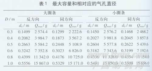-3m,H=0.91 m,v=10×10-3m,D分别为0.3、0.4、0.5、0.6、0.8和1.0 m时计算大、小圈条分别在同、反方向时的最大容量和相对应的do,结果如表1所示。