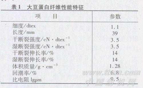 为了更好地体现大豆蛋白纤维的性能特征,尽量降低成本,采用纯大豆蛋白纤维纱、大豆蛋白纤维与棉混纺纱等纯织、交织等多种形式,开发出系列大豆蛋白纤维衬衣面料。大豆蛋白纤维选用细度为1.1dtex,长度为39 mm的棉型纤维,棉纤维采用长绒棉。大豆蛋白纤维的物理性能指标见表1。