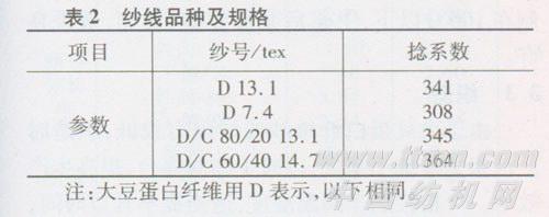 纺纱号数选择在7.4 tex~14.7 tex的范围内。由于大豆蛋白纤维产品有蚕丝的某些特点,特别适合春夏季贴身穿用,所以主要选择中细号纱开发中薄型产品。表2给出了几种纺纱规格。大豆蛋白纤维纯纺纱,颜色呈现自然淡黄色,光泽明亮,表面光洁、匀净,成纱棉结、杂质、毛羽均少于相同特数的纯棉纱。大豆蛋白纤维与棉混纺纱颜色略白,光泽柔和,但明亮程度降低。