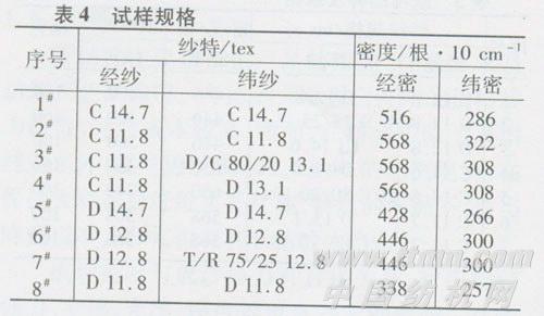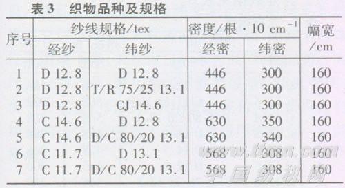 由于产品的定位主要用于春夏季衬衫面料,所以在设计中以府绸风格为主。产品外观细腻光洁,表面有菱形颗粒效应,色泽自然、亮泽,有丝绸效果,织物轻薄、透气,悬垂性好。采用平纹组织,确定密度时考虑尽量突出大豆蛋白纤维织物的效果。纯大豆蛋白纤维纱织物和经纱为大豆蛋白纤维纱的交织织物,大豆蛋白纤维纱在织物中起主导作用,为了突出大豆蛋白纤维产品的特色,进一步增加抗绉性和柔软程度,密度偏小设计。经纱为棉,纬纱为大豆蛋白纤维纱(或大豆蛋白纤维与棉、粘混纺纱)的织物,在设计中考虑以棉的风格为主,密度偏大设计。其产品规格见表3。