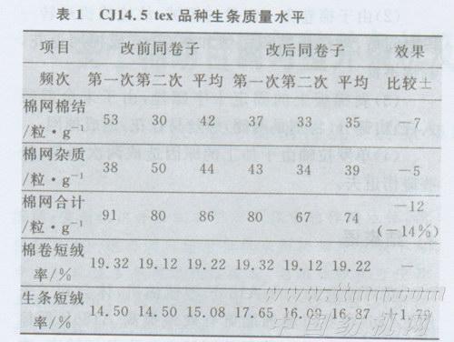 (2)用CJ14.5 tex品种在梳棉机125#试验生条质量水平,测试结果见表1。