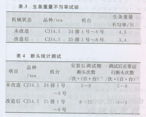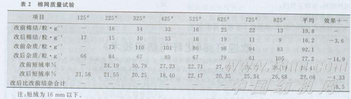 (1)单罗拉改造后,生条棉网结杂、生条短绒率降低较多,棉网清晰度较改造前更好,棉网更均匀、干净。
