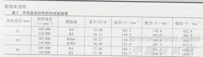 纺杯是Autocoro312型转杯纺纱机的关键性元件,纺杯直径的选择合适与否对转杯纺成纱质量影响很大,为此我们在C 32 tex品种上对不同直径的纺杯进行了纺纱优选试验,纺纱试验结果如表1所示。