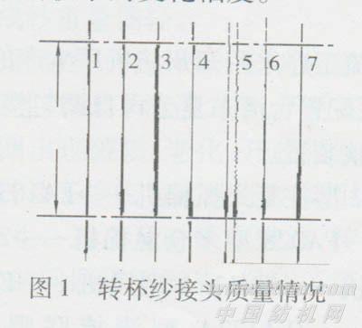 我们一般根据图1所示的接头质量情况来调整COROMAT接头器的参数。图1中1、2为正常接头;3为纺杯周长长度的粗节,解决方法是减少纤维喂入量E2,减少幅度小于10%;4为纺杯周长长度的细节,通过增加纤维喂人量E2来调整;5为在接头前有细节或在接头区域有纱线纠缠,我们通过减少喂人装置E3的启动,减少附加捻度或减少加捻时间来实现;6为在一个纺杯周长之后有细节,我们通过增加纤维喂人E3,改变附加长度或再设定喂入装置E3的启动来改变;7为接头太长,解决方法是减少附加长度。