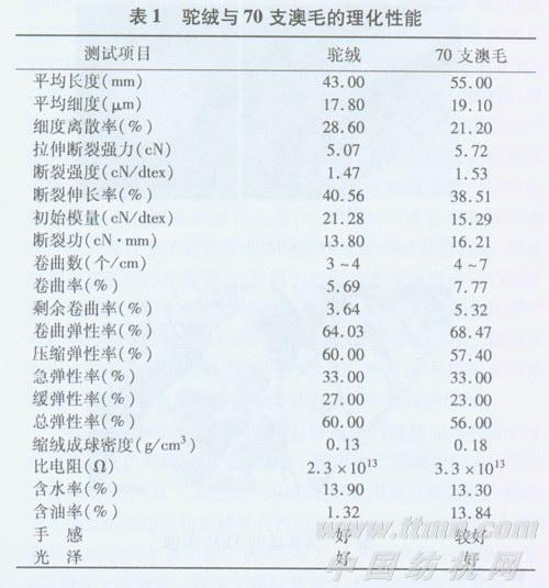 通过各种仪器对驼绒和70支澳毛的理化性能进行测试,结果如表1所示。