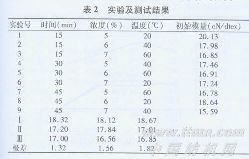 由表2可知,各工艺条件对驼绒改性影响依次为:温度>浓度>时间。以各因素的实际水平为横坐标,平均初始模量为纵坐标,作图1。由图1可知,初始模量随时间延长而降低。时间为15~30min时,初始模量的极差为1.12,时间为30—45min时,极差为0.20,说明30min以内初始模量降低较大;超过30min,初始模量降低较小,故选时间为30min。随浓度的增大,初始模量降低。浓度为5%-6%时,初始模量的极差为0.28,浓度为6%-7%时,极差为1.28,说明低浓度时,初始模量降低较小,高浓度时初始模量降低较大,故取浓度为7%。初始模量随温度的升高而降低。温度为20—40℃时初始模量的极差为1.66,温度为40~60℃时初始模量的极差为0.16,说明40℃以内,初始模量降低较大,温度超过40℃,初始模量降低较小,故取温度为40℃。