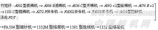 3 主要技术难点及工艺技术措施 通过纺纱我们认为竹纤维的可纺性能与粘胶基本相同。但纤维细度比较粗,达到1.95 dtex,造成单纱的外包纤维根数减少,单纤断裂干湿强度均较低。为了提高竹/涤包芯纱质量水平,我们在纺纱各工序采取了如下措施。