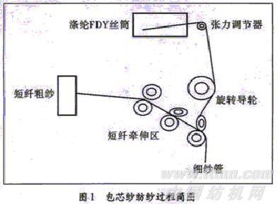 目前大多数涤纶厂家生产的涤纶FDY卷装都比较大,一般一个丝筒重量在5 kg左右,直径在300mm左右。在纺制包芯纱时,细纱每一个锭子要对应一个长丝筒子,把400多个丝筒都摆放到细纱机上难度很大。我们经过多种改造方案对比,最终选定一种比较简单可行的机架改造方法,使长丝筒子均匀摆放在粗纱架上方,挡车工操作方便,同时对机架本身基本无大的改造。在纺纱过程中涤纶DY采用被动退绕方式。包芯纱纺纱过程简图见图1。