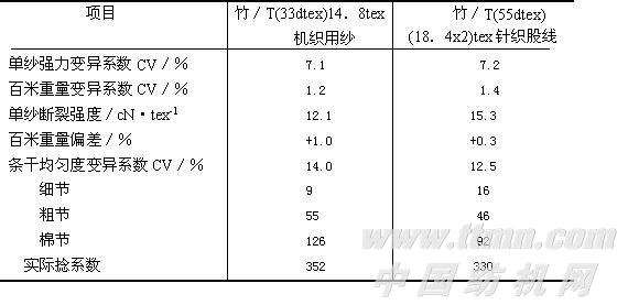 由于涤纶包芯纱芯丝比较光滑,单纱在后工序与机件磨擦过程中,外包短纤易剥落,造成裸丝纱疵。提高包芯纱捻系数可以使短纤与芯丝紧密抱合,对改善包芯纱的耐磨性有利。但是涤纶长丝具有较强的抗扭性,如果捻度偏大,包芯纱在后工序加工过程中就容易扭结形成小辫子。故涤纶包芯纱捻系数应慎重选择。我们在兼顾各方面因素的基础上,将竹/涤包芯纱捻系数选定为350左右。单纱质量见表3。