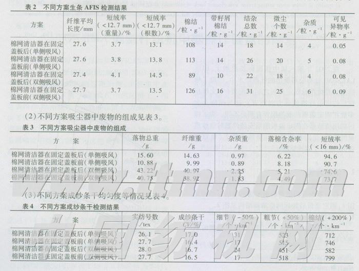 由表3测试数据可知,棉网清洁器安装在固定盖板后吸走废物总量比较多,杂质量多,短绒率高。这与上述的生条AFIS质量指标大多是相吻合的(除了双侧吸风的短绒率相反外),表明在固定盖板后安装棉网清洁器有利于生条质量的提高。