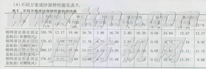 无论是单侧吸风还是双侧吸风,棉网清洁器安装在固定盖板后成纱强伸性能指标都是比较差的,除了断裂强度等可能是纱号较细原因所致,其他所有指标如CV值也是较差的。这说明,棉网清洁器安装在固定盖板后的方案不利于成纱强力指标的改善。