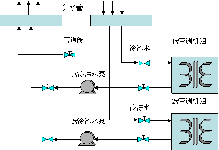 当1#机组开起后,1#流量必须满足最低流量值200 m3/h,如果用户流量没有达到最低流量值时,机组就会停机保护,值班人员必须提前打开旁通阀,使部分冷冻水在机组内循环来保证机组内有200 m3/h以上的流量。2#也如此。