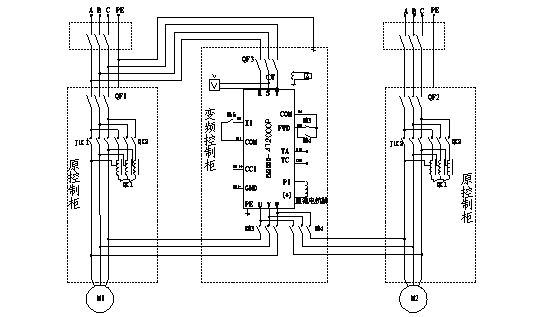 系统采用工变频互备,另外可以灵活的选择需变频的电机是1#还是2#由KM3、KM4来完成。
