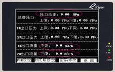 (1)友好的人机界面:由于系统需对每台机组的进口压力、出口压力、出口流量、总压力的上限值和下限值,PID参数进行设置,还要对所有的压力、流量值进行显示,还有报警信息进行记录。采用Eview的MT506LV人机界面。界面编辑了“主画面”、“控制画面”、“参数设置”、“故障记录”、“压力曲线”、“帮助”六个基本画面。主画面上对采集的压力、流量值、变频器的运行频率、电流进行显示,还显示系统当前状态和故障显示,让用户一目了然。
