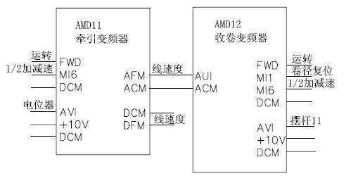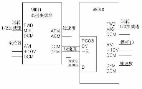 AMD11牵引变频器中AVI为主调速信号,通过一个可调电位器接入;DFM为频率数字输出,对应实际输出频率H(也可选择对应给定频率F),作为实际线速度信号提供给AMD10变频器。AMD10牵伸变频器中AVI为摆杆信号,做为PID的反馈量进行微调;PG03中-B接受上级发送的线速度信号作为理论频率的计算基础;DFM信号作为实际线速度信号传送给下一级。牵伸变频器控制的塔轮直径固定,通过参数设定。FWD为运转信号,统一由PLC给定;MI6为1/2加减速信号,作为急停时使用。