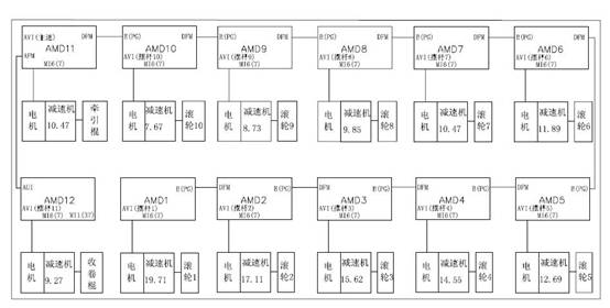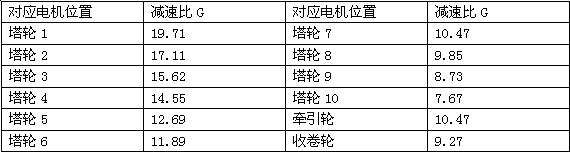 本机器共有10个塔轮,1个牵引轮,1个收卷轮,11个模具,以及11根摆杆,最大进线直径2.4mm,最小出线直径0.3mm,最高线速度2.5m/s。塔轮直径均为250mm,牵引轮直径为360mm,收卷轮最小直径为280mm。原料线材通过11个模具的11级拉伸,变成需要线径的成品线材。每个塔轮由1台电机控制,牵引轮和收卷轮也分别由1台电机控制。每台塔轮配置摆杆一根,作为恒张力控制时使用。每台电机都通过减速机与机械连接,减速比如下表1所示(减速比G为负载侧齿轮/电机侧齿轮)。整机结构示意图如图2所示。