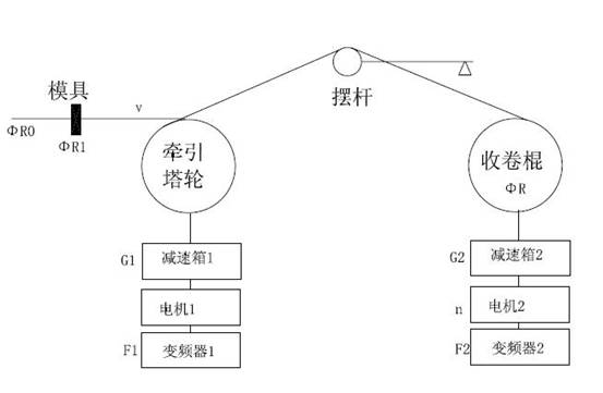由于并列式拉丝机由11组牵伸机构和1组收卷机构组成,所以我们单独对一组牵伸机构和一组收卷机构来进行控制原理的分析。图3为一组牵伸机构的结构示意图。