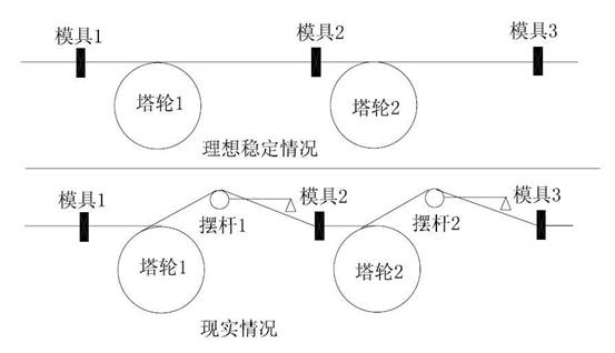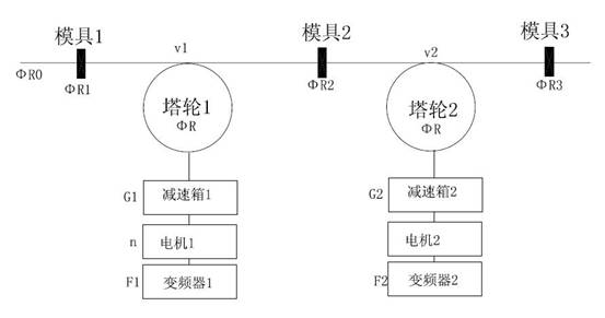 图4中假设塔轮直径为R,模具1直径为R1,模具2直径为R2,模具3直径为R3,进线直径为R0,电机1减速齿轮比为G1,电机2减速齿轮比为G2,变频器1指令频率为F1,变频器2指令频率为F2,塔轮1上的线速度为v1,塔轮2上线速度为v2,n为电机1转速,s为电机1转差率,p为电机1级对数,t为时间。G1定义为(负载侧齿轮10-24/电机侧齿轮10-23)。