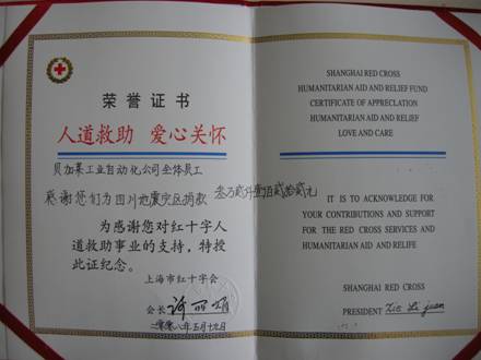 在贝加莱(中国)行政部的组织号召下,贝加莱迅速做出反应。5月14日,贝加莱(中国)总部大楼内举行了“守望相助,共度难关”——贝加莱抗震救灾募捐活动。员工们纷纷慷慨解囊,踊跃捐款,短短几天时间捐得善款36532元,贝加莱公司捐助15万元,共计186532元,并于5月19日上午送到上海红十字会。