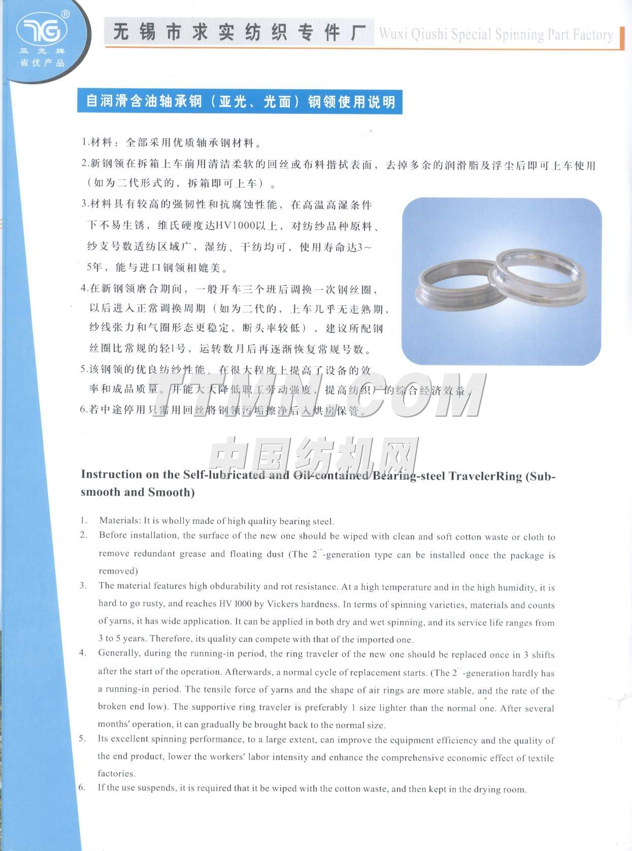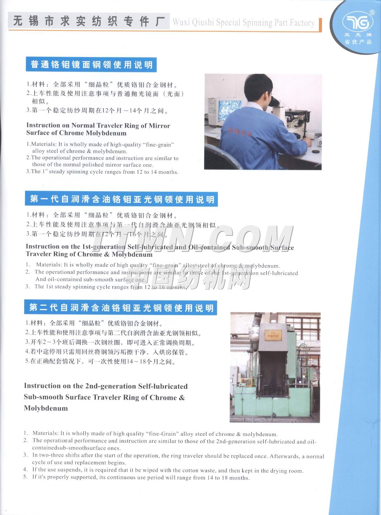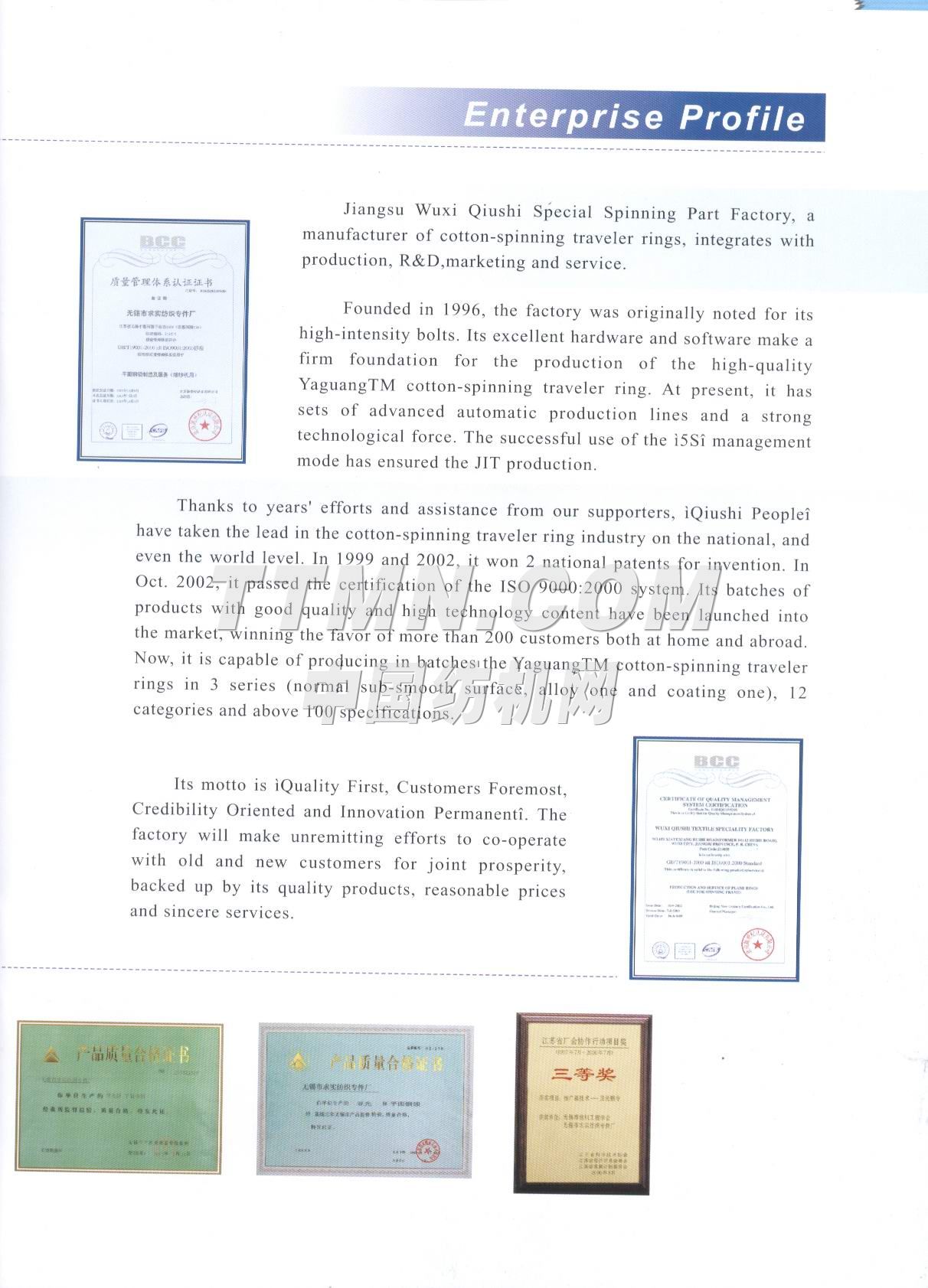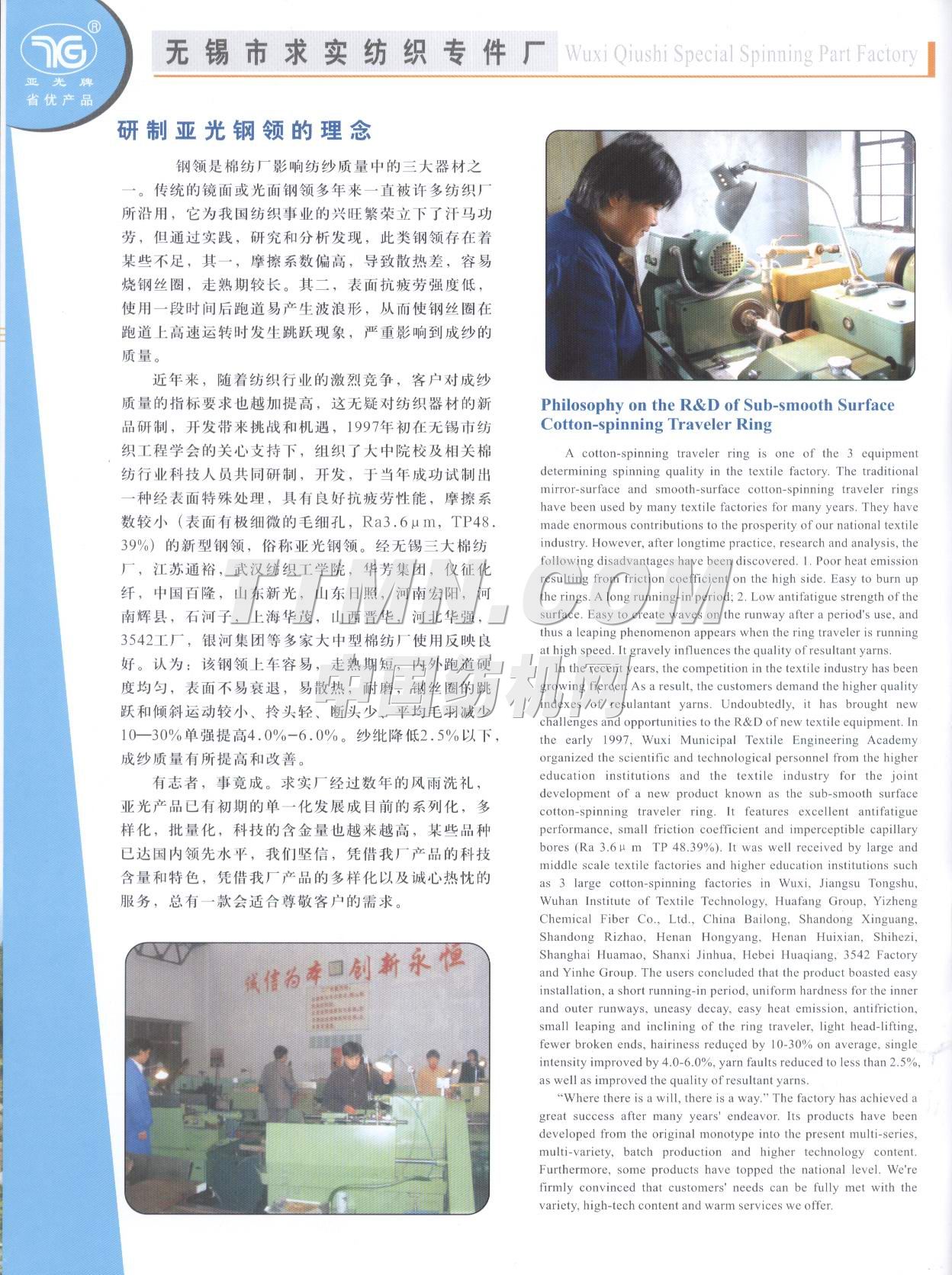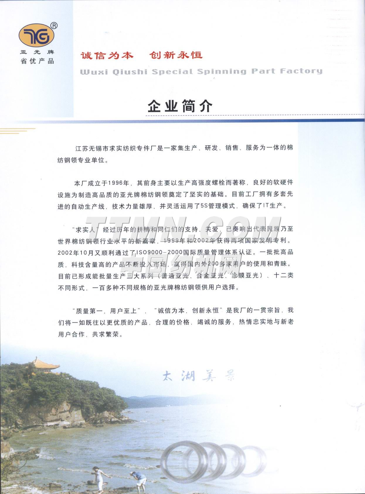 江苏省无锡市求实纺织专件厂是一家棉纺钢领的专业性工厂,也是全国纺织器材行业协会成员之一。 该厂组建于1996年,位于江南名城太湖之滨的(2001年3月被国务院命名为特大城市)无锡市市区,座落在惠泉山南麓和古运河河畔,距市中心5分钟车程。距火车站、长途汽车站8分钟车程,距上海虹桥机场80分钟车程,交通运输十分便捷。 从建厂之日起我厂就致力于对 棉纺钢领的不断潜心研制和新品的开发,现有正式员工58名,其中中级职称人员3名,初级职称人员6名,技师5名,聘请高等院校和科研单位教授2名,产品品种已有初期的发展到到目前的系列化、多样化、批量化。产品的结构和科技含量更是日新月异目前已有自润滑含油亚光(I)型、(II)型、(III)型、钢领可供客户选择,其中(III)型钢领有望填补国内空白而最终替代进口产品。2000年7月我厂产品被江苏省科协、经委、计委评为扩广技术----亚光钢领项目三等奖,时隔一年又被江苏省产品质量监督调查办公室确认为“江苏市场名优产品”,已连续三年被国家纺织检测中心检验为合格产...