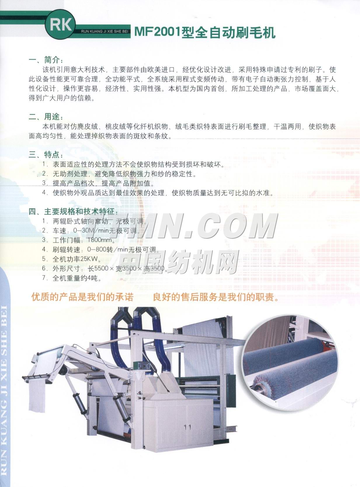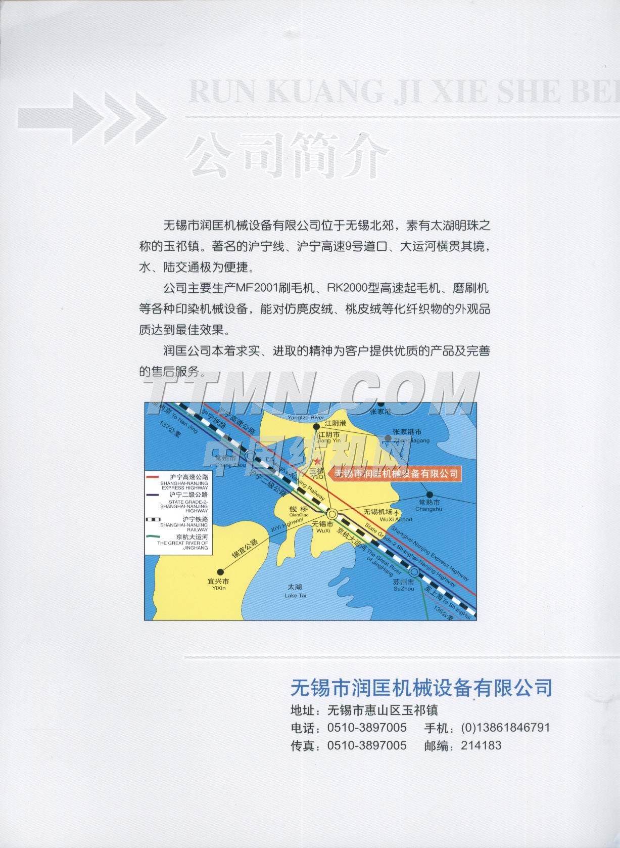 无锡市润匡机械设备有限公司位于无锡北郊,素有太湖明珠之称的玉祁镇。著名的沪宁线、沪宁高速9号道口、大运河横贯其境水、陆交通极为便捷。公司主要生产MF2001刷毛机、RK2000型高速起毛机、磨刷机等各种印染机械设备,能对信麂皮绒、桃皮绒等化纤织物的外观品质达到最佳效果。润匡公司本着求实、进取的精神为客户提供优质的产品及完善的售后服务。 ...