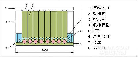 由1风车将棉花送入每一棉盒,由微压开关控制棉位,不同棉仓以差速输出达到高倍混功能,由空气对流将原料往后道设备输送。