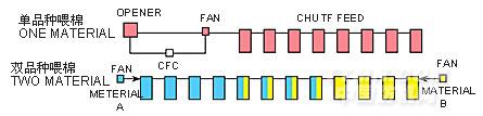 1.一条生产线一般供应6-10台,由开棉机、清棉机至UF-80A供棉量由1组连续供棉控制系统CFC所管制,依实际产能自动调节,使整条供棉压力维持一定的水平。