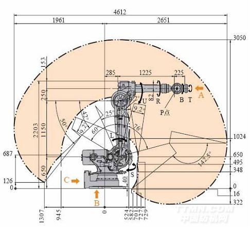 在本体回转轴上可以安装机械档块,并且可随时改变其安装位置,即使在外部电缆联接后也可进行。可动区域限位开关及可变机械档块可以安装在本体回转轴上、上臂轴及下臂上。