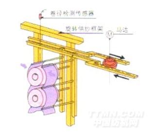 ③AP 自动防止纠缠装置,抽 出筒子架上的加捻丝时,该装置在筒子的两边像夹持筒子那样地垂下针织布,随着筒子直径的减小,自动缩小针织布,使纱表面和针织布的接触阻力保持不变;