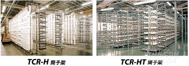 ⑦TCR-HT型为推车式筒子架,将筒子插入备用的换筒小车上,需要换筒时,将小车推入筒子架,即可开始抽丝;在大卷装纱筒的换筒作业时,还可以采用升降机减轻劳动强度。
