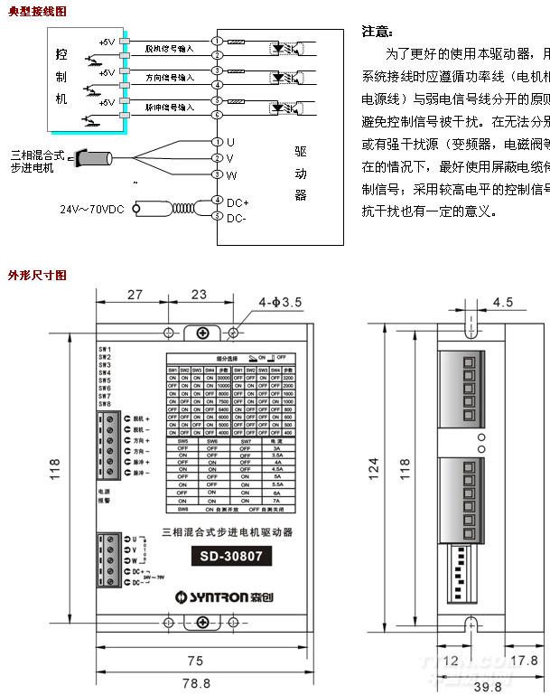 用户可以通过驱动器面板上的第8位拨码开关选择自测模式的开放与关闭,自测模式开放时驱动器将在每次上电之初对电机参数进行观测,并自动寻求最优控制参数。自动测试功能关闭时驱动器将调用上一次测量的电机参数进行工作。因此当用户首次使用驱动器和电机时应该采用自测模式进行电机参数的自适应匹配,之后就可以将开关设定为OFF锁定当前参数。当工作状态发生变化后可以重新自测寻优。自测设定只在每次驱动器上电时进行处理,因此SW8状态的变化只能在驱动器重新上电后生效。