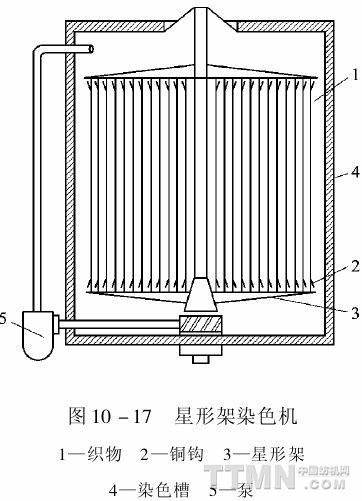 1.星形架染色机 星形架染色机,是目前国内外仍采用较多的丝织物染色设备之一,如图10—17所示。