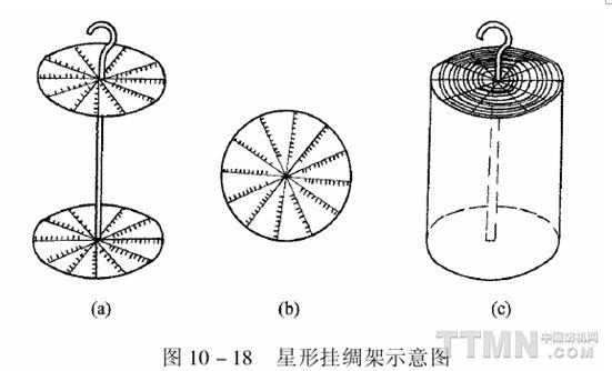 它主要是由一只大染色槽和一个挂绸星形架组成。染槽呈圆柱形或方形,用不锈钢材料制成,可直接和间接加热,还备有循环泵,可使染液循环。织物被一层层挂在星形的挂绸架上,所谓星形架是一只两头有圆盘的金属架。如图10—18(a)所示。圆盘的连接档上装有许多挂钩,织物就挂在钩上。如图10—18(b)和图10—18(c)所示。因为挂绸钩之间相隔一定的距离,所以织物层与层之间也相隔一定距离而互不相碰,由于圆盘的横档通过圆心向外伸展呈放射形似星状,故称星形架。