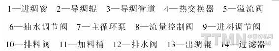 SDF丝绸溢流染色机: SDF丝绸溢流染色机由染槽、导绸辊、加料桶、热交换器、过滤器、进出绸架和各种管路组成。结构如图10-20所示。当织物进入染槽后,由水流带动织物平滑向前移动。每条染色管配有两条独立导绸管道分隔绸匹,保证织物在最佳状态下移动,井使织物在染槽的任何部位均能与染液接触或浸于染液中,由于染槽是相通的,故染色均匀。