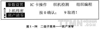 根据此项参数可将纬纱的根数换算成布的米数,然后统计织布产量。除了设定的位数不同以外,纬密的输入与布长输入基本相同,小数点不影响设定,因此可参照布长进行输入,“回车”确认后退出到二级菜单。 二级菜单的第五项是“班产清零”,按“↓”键,移动反色条到“班产清零”,按“回车”键选中该项,显示如图1—58。