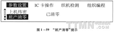 “班产清零”清除包括当前班次的产量,继纬数,断经数,效率等统计参数。按“9”键,取消操作回到二级菜单,按“0”键,清除以上内容,然后提示“已清零”,如图1—59,按“回车”后返回到二级菜单。