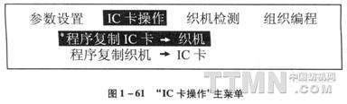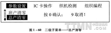 “总产清零”清除统计的总织布产量。其操作与“班产清零”相同。主菜单的第二项是“IC卡操作”,进入此项后,显示如图1—61。