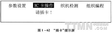 “IC卡操作”项是专为方便用户而设计。以往,织机在更换新品种时,每台电控箱都要从新设定一遍组织程序,这是一项既繁琐又重复的工作,而且新程序编好,旧程序被冲掉,组织程序无法长期保存以备后用。而IC卡在织机组织编程中的应用,很好地解决了以上问题,一片比卡可同时储存16个不同品种的组织程序,每个程序最大可同时设定长达6000段的选纬程序,这样在多台织机织同一品种时,只需在一台织机上设定该品种的组织程序,然后复制到IC卡上,再利用IC卡将程序复制到其他织机上即可。如果该品种在一段时间内不再生产,可将其程序保存在卡上,以备将来再次使用,IC卡的数据可保存10年以上而不会丢失。 “IC卡操作”的二级菜单共有两项,按“↑”“↓”键,任选其中一项,按“□/■”键返回主菜单,或按“→”“←”键直接进行其他主菜单项的选择。“程序复制IC卡→织机”是将IC卡上的程序复制到织机“回车”确认,此时如卡已插好,屏幕提示如图1—63,如果此时没插卡,屏幕提示如图1—62。