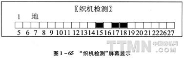 复制完成后指示灯灭,返回主菜单。 “程序复制织机→IC卡”与“程序复制IC卡→织机”的操作完全一样,不同的只是复制的方向不一样,前者是保存程序到IC卡,而后者是从IC卡调用程序。 主菜单的第三项是“织机检测”,“回车”进入此项后,屏幕显示如图1—65。