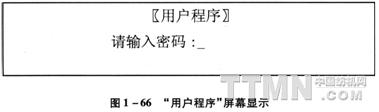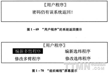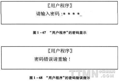 屏幕提示进入此项需输入密码,本系统使用固定密码“1234”,依次按“1”、“2”、“3”、“4”,光标后移如图1—67,密码不可见,此时“回车”即可进入“组织编程”,数字输错或多输,系统将给出出错提示如图1—68,按“回车”重新输入,允许试三次,第三次输入错误,提示系统返回如图1—69,按“回车”键返回主菜单。
