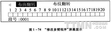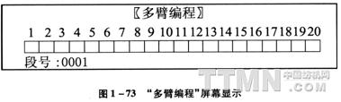 多臂使用状况是指,所有20片多臂中的哪几片将被使用。在此状态下,键盘上按键的第二功能起作用,1-20个数字键对应1—20个臂,每按一次键,对应臂的状态变换一次,对应的方框或空或实,空表示该片多臂禁用,实表示该片多臂将被使用,被禁用的多臂在多臂编程时输入无效,按要求输入完成后,“回车”确认进人多臂编程。 进入多臂编程后,屏幕显示如图1—73。