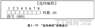 由于是新编程序,进入后首先将存储区清零,并从第一段开始编程,按键“F1”—“F8”对应 1—8号选纬指,每段中只能设定一个选纬指,对应方框实表示选中,纬数设定可直接输入数字,最大99纬。选纬编程中段号的加减与多臂编程中相同。编程结束后,检查无误,“回车”确认退出到二级菜单。 选中“修改选纬程序”,屏幕不再提示输入最大段数,而直接进入修改程序,显示仍如图1— 75。与新编程序不同,进入修改程序后不会对存储区清零,而是显示已存内容,以供修改,修改的方法与新编程序相同。修改完成,“回车”确认退出到二级菜单。 主菜单中各项设定完后,织机就可以正常工作了。 其他剑杆织机以生产厂商的电气使用说明书为准。