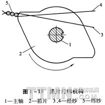 在主轴1上排列着多角形的筘片2,经纱3和4嵌在相邻筘片之间的缝隙中,筘片随主轴回转时,其打纬半径就将纬纱5推向织口。其传动机构简单,运转平稳,适宜于高速运转,但异型筘片制作成本高。